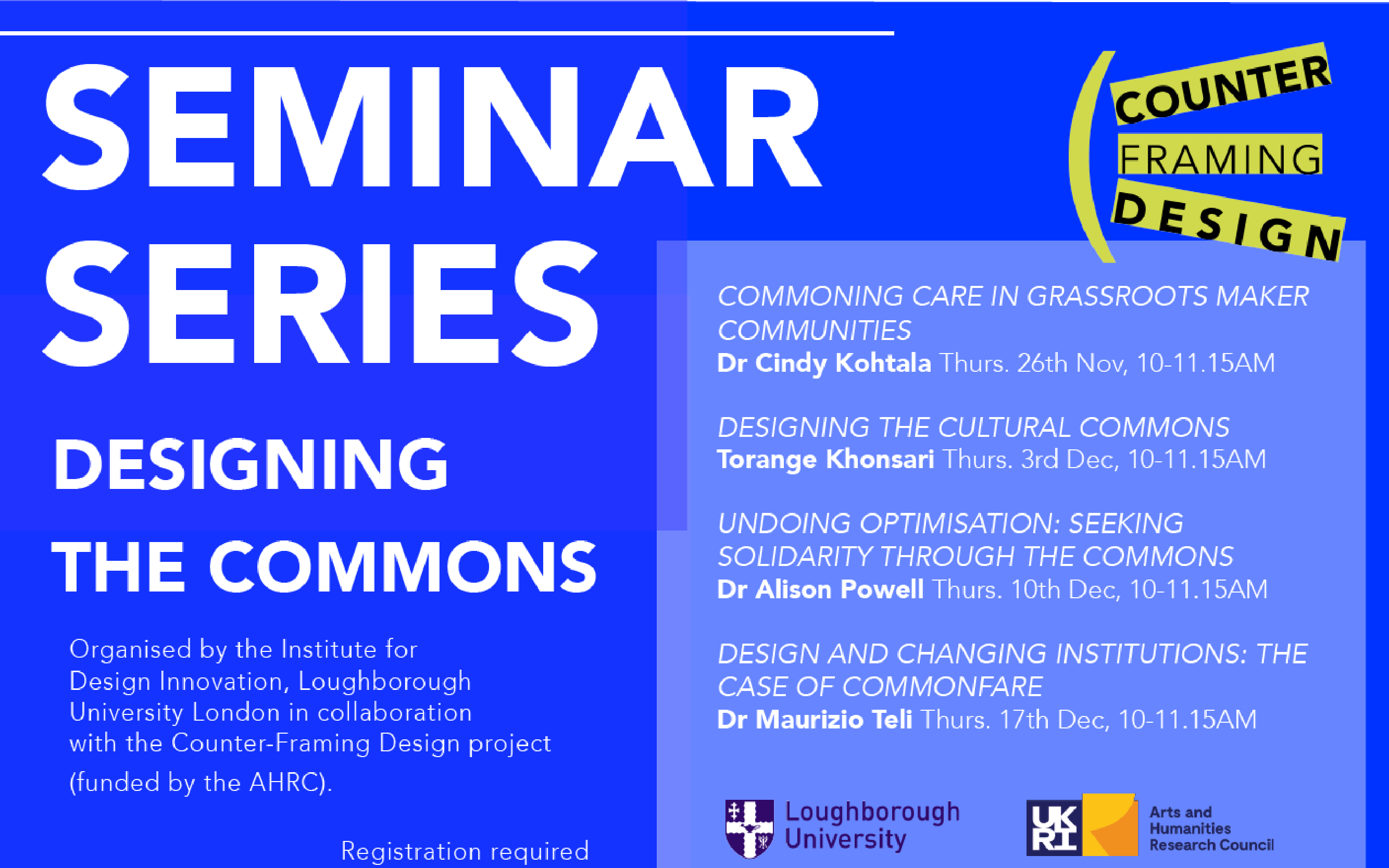 This seminar series is organised by the Institute for Design Innovation, Loughborough University London as part of the ‘Counter-Framing Design‘ project.